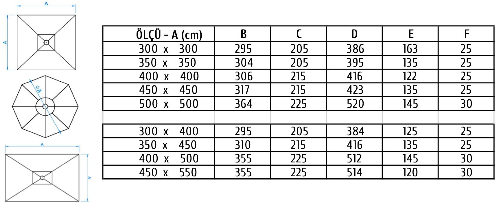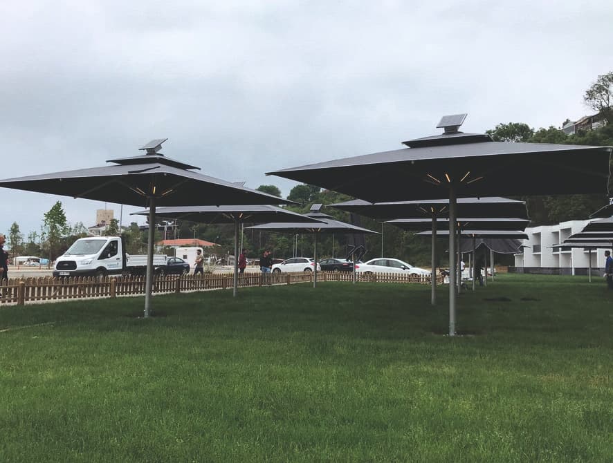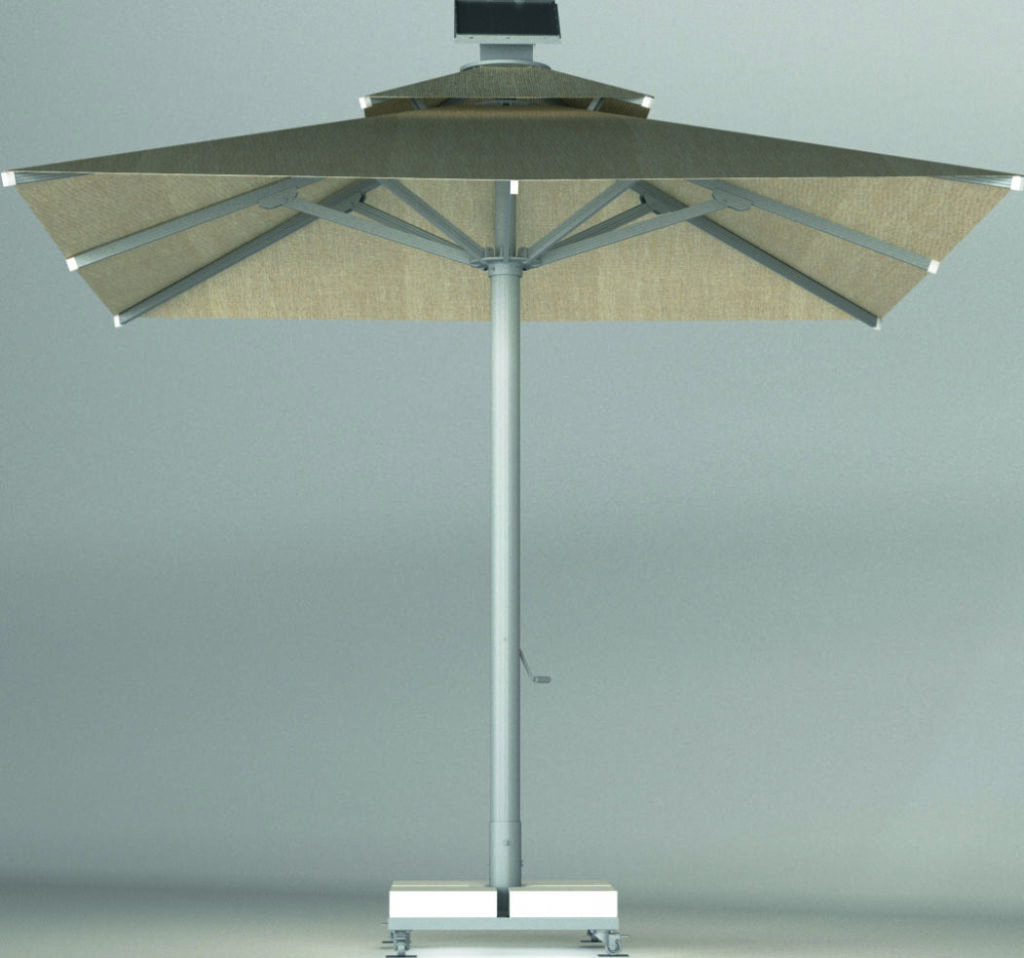 Mevcut şemsiyeye ilave olarak Güneş enerji paneli, kesintisiz güç kaynağı ve elektronik kontrol paneli sayesinde gece kullanımına uygun, uzaktan kumanda ile korniş tipi ledli sistem aydınlatma yapabilme özelliğine sahip bir üründür. Ortalama 6-8 saat aydınlatma sağlamaktadır. Çalışma gerilimi 12V’dur.